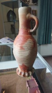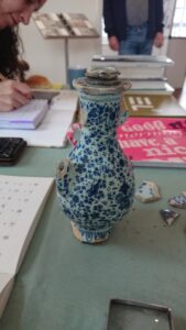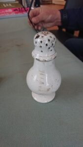 Een meneer kwam een langwerpig potje laten zien, dat hij bij de Grote Sloot in Warmond had gevonden (zie foto). Het bleek te gaan om een strooier (voor bijv. peper en zout), vervaardigd omstreeks 1850.